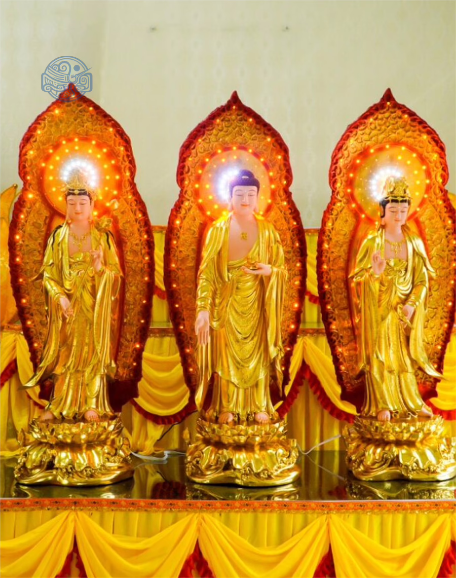 Bộ tượng Tây Phương Tam Thánh Đứng bằng composite, cao 120cm, dát vàng (có lá đề kèm đèn led)