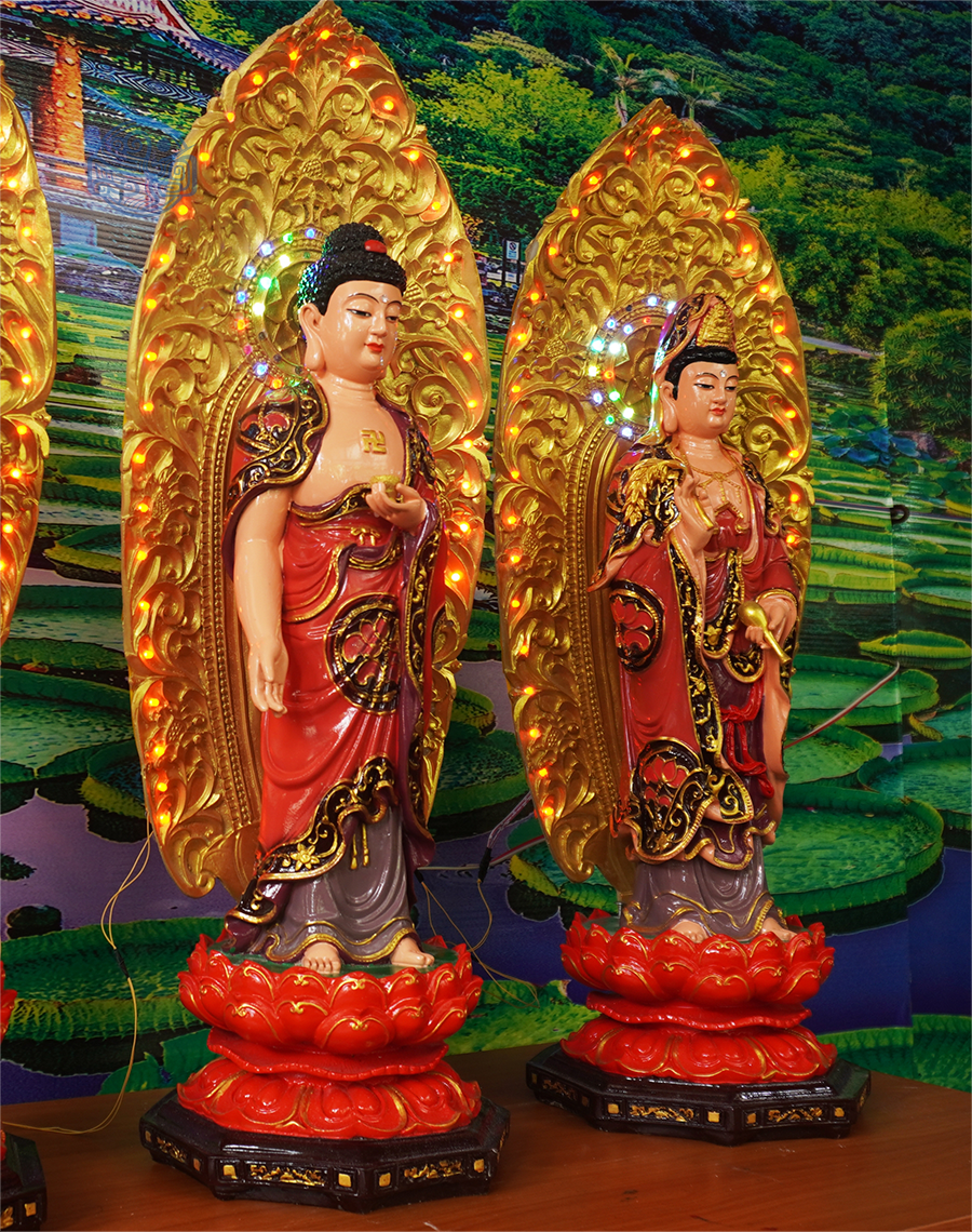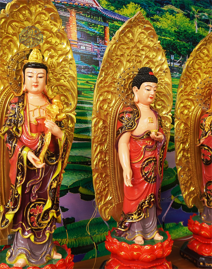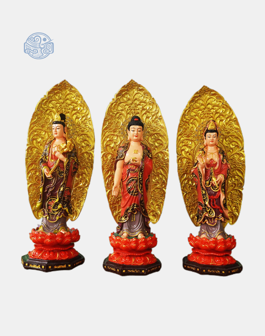 Một số hình ảnh bộ Tượng Tây Phương Tam Thánh Đứng Bằng Composite, Vẽ Màu Cao Cấp (Có lá đề và đèn led)