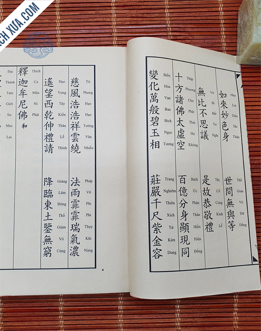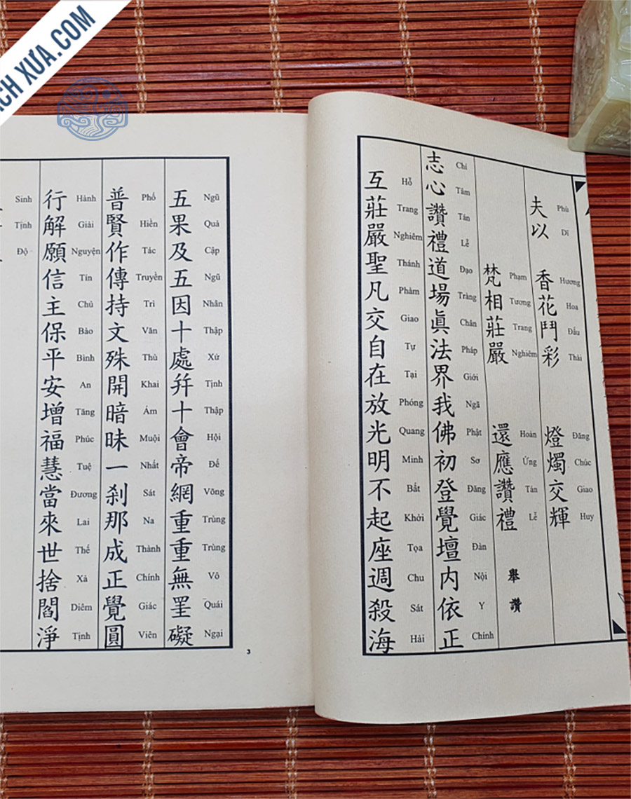 Sách được khâu thủ công theo lối cổ, giấy xuyến chỉ hoặc giấy trắng cổ gấp đôi, đọc ngược từ phải sang, khâu gáy bằng chỉ dù, quét keo, tem sách chống xước, mực in chống nước không phai màu, số lượng chỉ có vài cuốn.