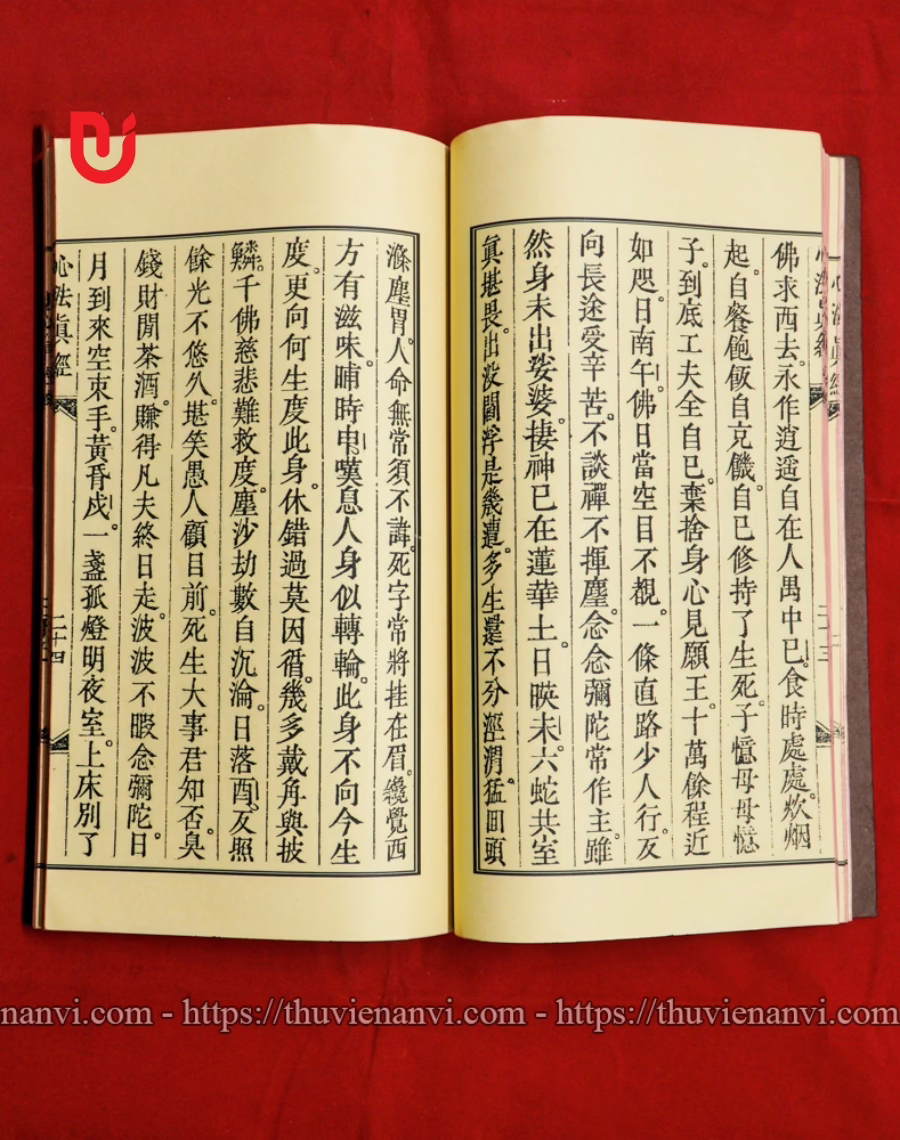 • Quy cách: Sách được khâu thủ công theo lối cổ, bìa cậy nâu, in giấy xuyến chỉ gấp đôi, đọc ngược từ phải sang, khâu gáy bằng chỉ dù, quét nâu, tem sách chống xước, mực in chống nước không phai màu.